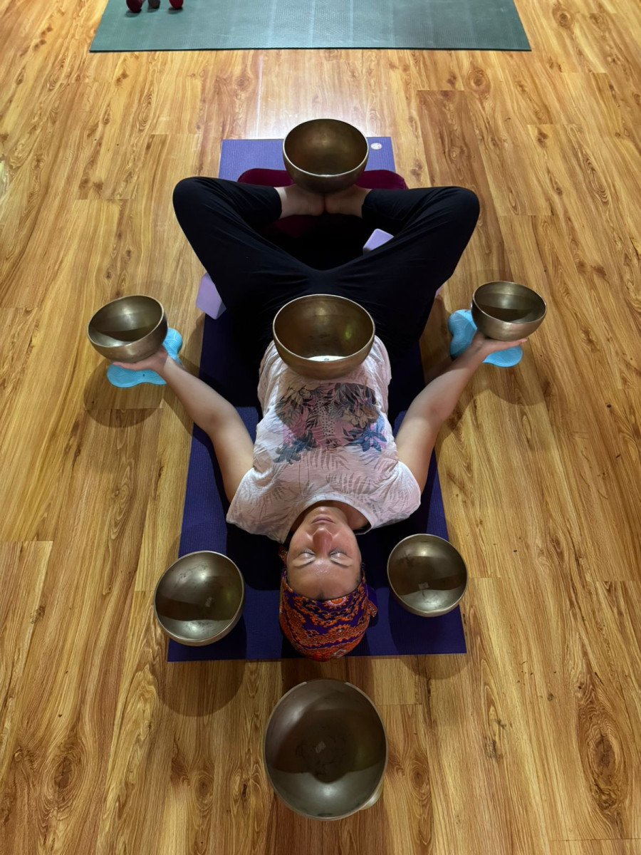 Vibrational Restorative Yoga Using Singing Bowls (60 Minutes) This is a special fusion of restorative yoga and sound healing. You will learn how to place singing bowls on the body during yoga poses, allowing the sound vibrations to travel deep through the bones and tissues — creating instant, powerful relaxation.